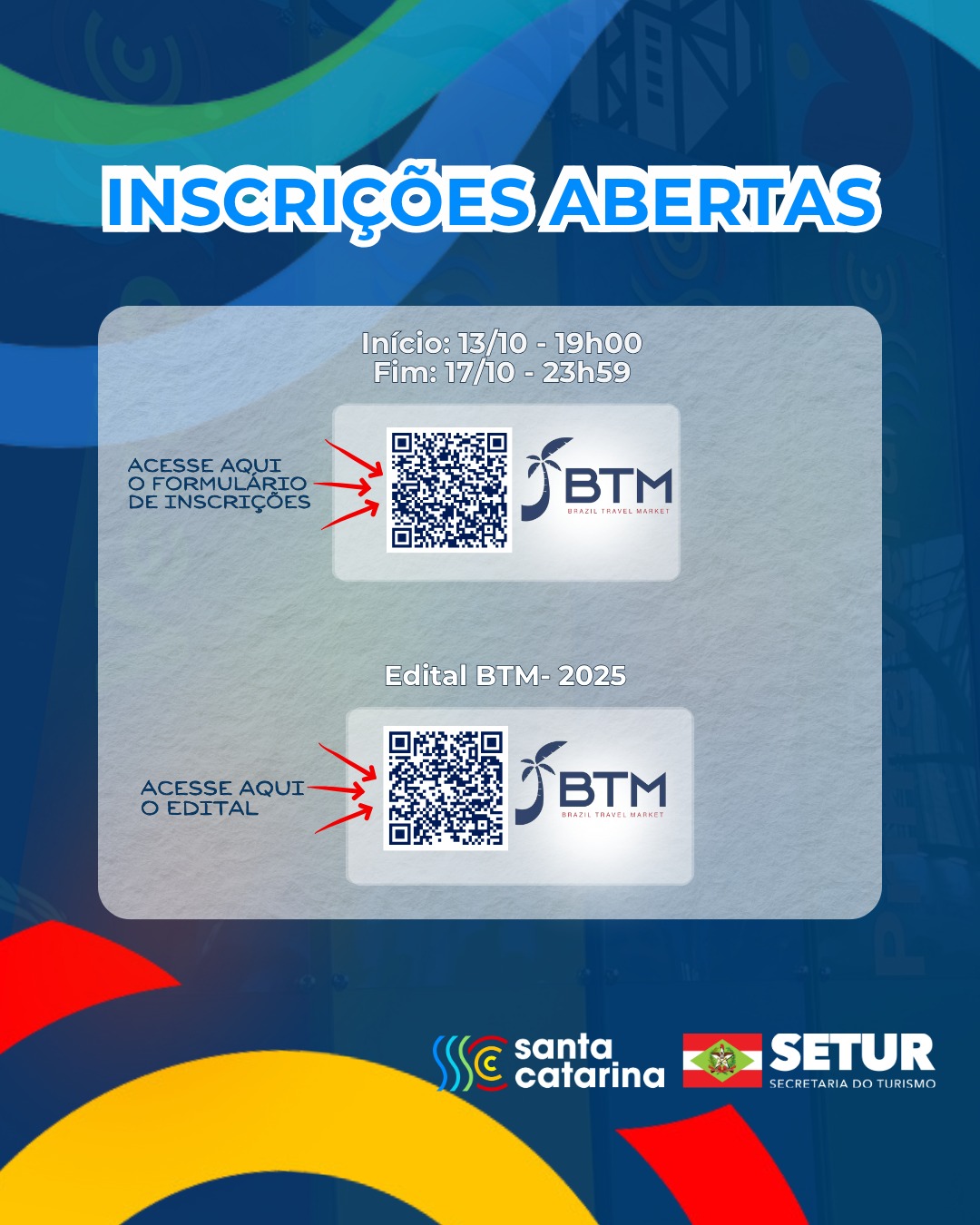 A Secretaria de Estado do Turismo de Santa Catarina (Setur/SC) torna público a seleção de interessados em participar, como coexpositores, no estande do estado de Santa Catarina na BTM (Brazil…
