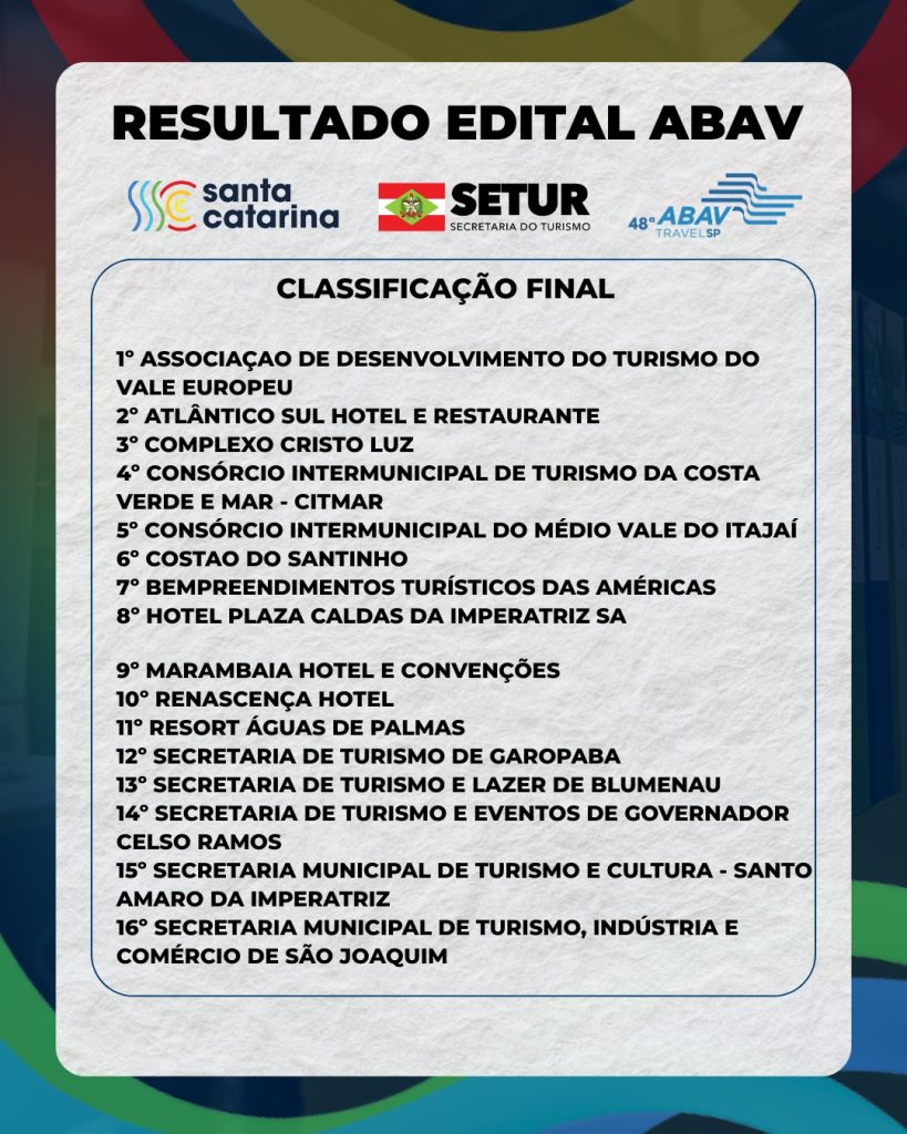Confira abaixo a lista com o resultado dos aprovados para representar Santa Catarina ao lado da Setur na ABAV TravelSP 2026, que acontecerá nos dias 11 e 12 de março, no Royal Palm Hall, em Campinas (SP).