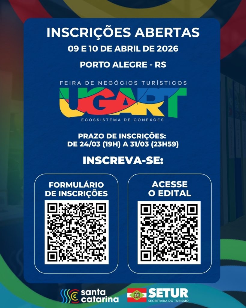 A Secretaria de Estado de Turismo de Santa Catarina – SETUR/SC vem a publico comunicar que realizará a seleção de interessados em participar, como coexpositores, no estande do estado de Santa Catarina na 40ª Feira de Negócios Turísticos UGART 2026, na cidade de Porto Alegre RS. As informações com as regras e datas deste edital podem ser conferidas através do QR-Code do card acima e se faz necessário o preenchimento do formulário através do link: