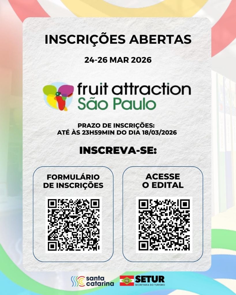 As inscrições estão abertas para participar ao lado da Setur/SC na Fruit Attraction São Paulo 2026. A feira reúne produtores, compradores e empresas do setor de frutas e hortaliças, promovendo negócios, inovação e a valorização do alimento como produto turístico, especialmente por meio das indicações geográficas, que conectam território, identidade e experiência. A participação ao lado da Setur integra a estratégia de promoção de Santa Catarina, ampliando a visibilidade do estado e fortalecendo conexões comerciais e turísticas.