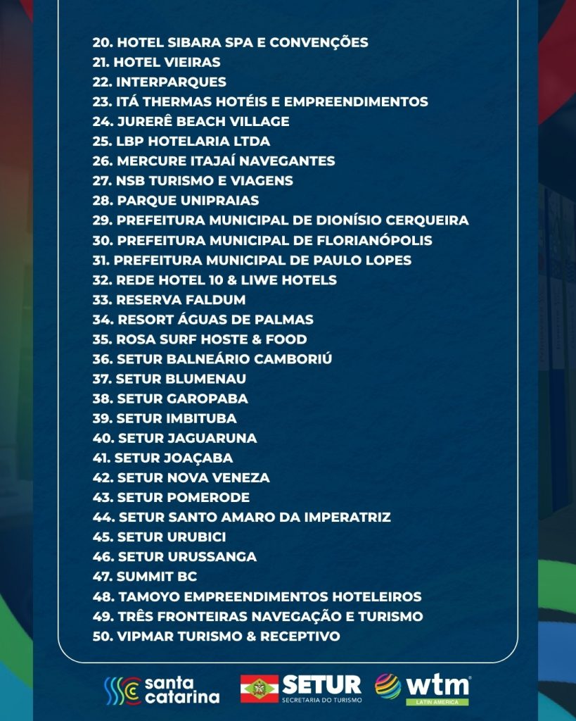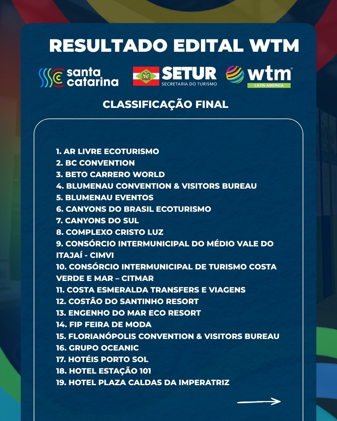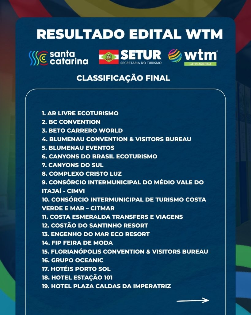 A Secretaria de Estado do Turismo de Santa Catarina – Setur/SC torna público a lista dos classificados para participarem como Coexpositores no estande de Santa Catarina na WTM Latin América 2026, em São Paulo nos dias 14 a16 de abril. Segue abaixo a lista dos classificados: